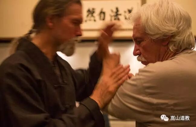 在大洋彼岸还有这样一群人在默默坚持寻道之旅。Harrison Moretz和学生一起练习推手。Moretz是陈氏太极传人,他常身着一身黑,束发盘髻,作传统的道士装扮。他生长在美国印第安纳州,1981年到大陆他学习并精进了中文、太极、中医,风水,古琴等。