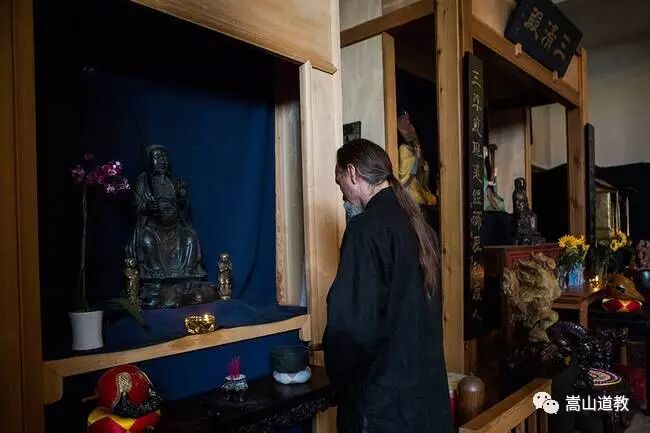 Moretz点燃神台上的油灯。不论是衣着、仪式规范还是生活方式,他都遵循着道家的原则。他说:“道家的两个重要思想是自然和无为,道教的基本原则是养生;而西方文化是消费,是收获,是持续增长,这是问题所在。”