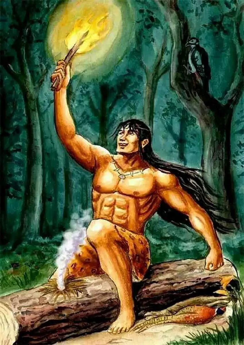 「燧人氏」,发明钻木取火的方法。让人们享受到光明,让人们无须生活在黑暗中,他的事迹是对人类最初征服火的一曲颂歌。人征服了火,火磨炼了人,人成了星际间的万物之灵。
