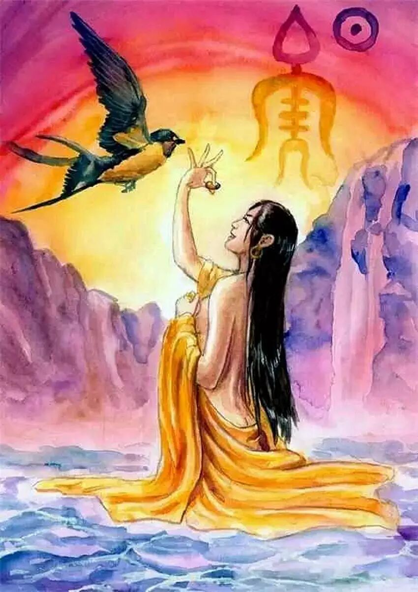 在远古的黄河之滨,一只「玄鸟」唱着歌儿从空中飞来,带给人们无穷无尽的遐想――它是天的使者,原始部落的人们一个个对它顶礼膜拜。一个叫简狄的女人,吞服「玄鸟」下的蛋后,怀孕生下一个儿子叫契。契,即是阏伯,就是传说中的商之始祖。《诗经·商颂·玄鸟》曰:「天命玄鸟,降而生商。」这就是「玄鸟生商」的美丽故事。
