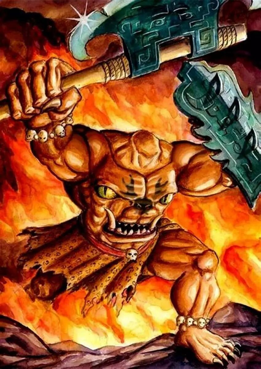 刑天是山海经里提到的一位无头巨人,原是炎帝的手下。自炎帝被黄帝在阪泉之战打败之后,刑天便跟随在炎帝身边,定居在南方。当时,蚩尤起兵复仇,却被黄帝铲平,因而身首异处,刑天一怒之下便手拿着利斧,杀到天庭中央的南天门外,指名要与黄帝单挑独斗。最后刑天不敌,被黄帝斩去头颅。而没了头的刑天并没有因此死去,而是重新站了起来,并把胸前的两个乳头当作眼睛,把肚脐当作嘴巴;左手握盾,右手拿斧。因为没了头颅,所以他只能永远的与看不见的敌人厮杀,永远的战斗。
