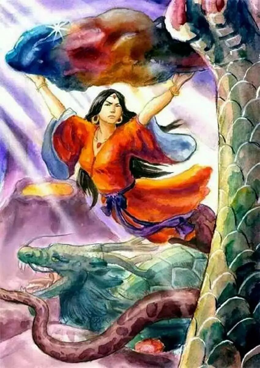 女娲氏,一位美丽的女神,身材象蛇一样苗条。女娲补天的故事和盘古开天的故事一样,都是中国人家喻户晓的。女娲时代,随着人类的繁衍增多,社会开始动荡了。两个英雄人物,水神共工氏和火神祝融氏,在不周山大战,结果共工氏因为大败而怒撞不周山,引起女娲用五彩石补天等一系列轰轰烈烈的动人故事。女娲补天是一个很著名的传说。