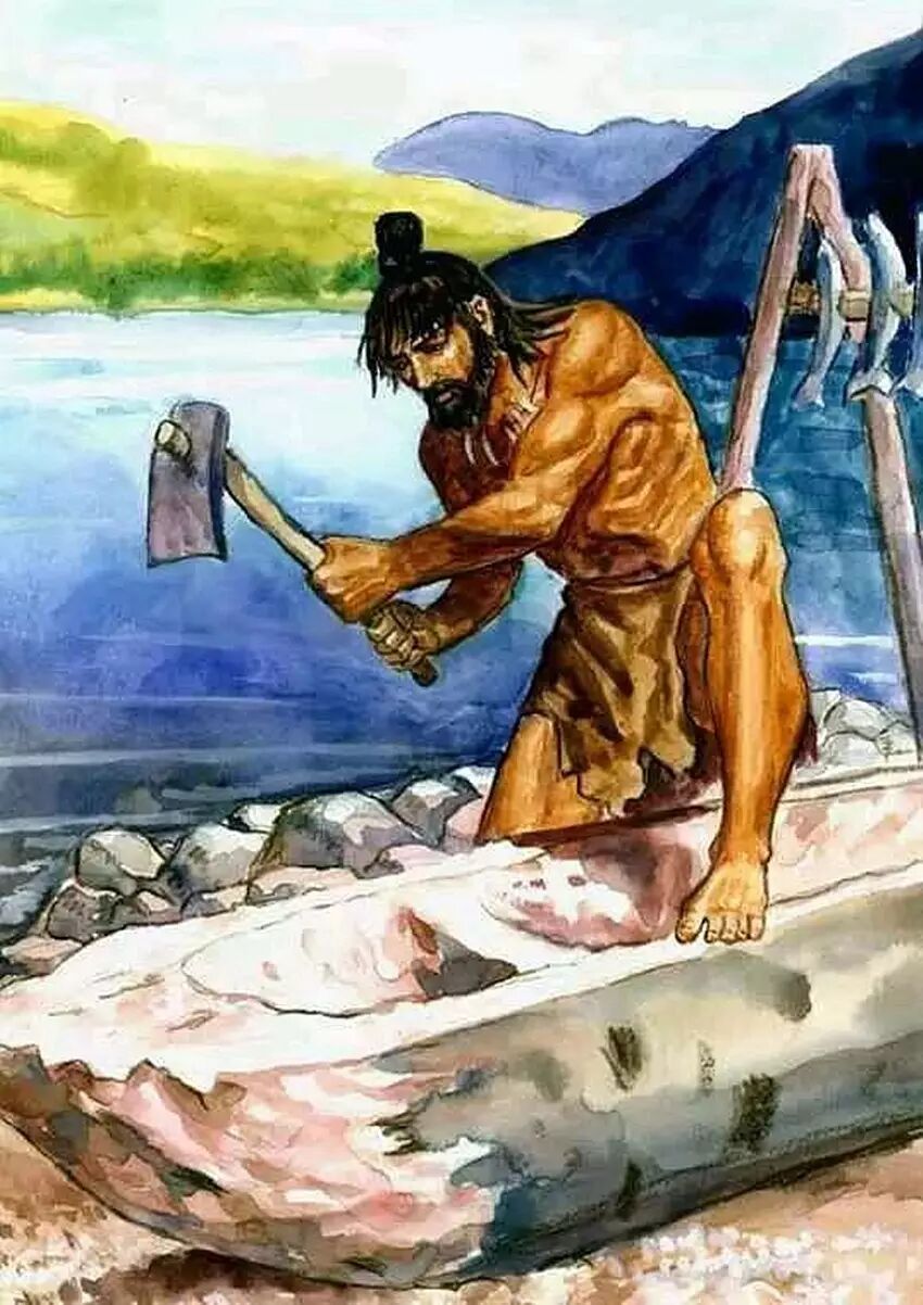 共鼓,黄帝贤臣,一次山洪暴发原来,有棵大树和共鼓被洪水一直冲下山,卷进一条大河里。他抓住这棵大树,始终没有放开。当他两缓过气来发现洪水不论怎样上涨,这棵大树始终浮在水面上沉不下去。原来,这棵大树半面子都是空的。于是灵感泉涌,凿木为舟。