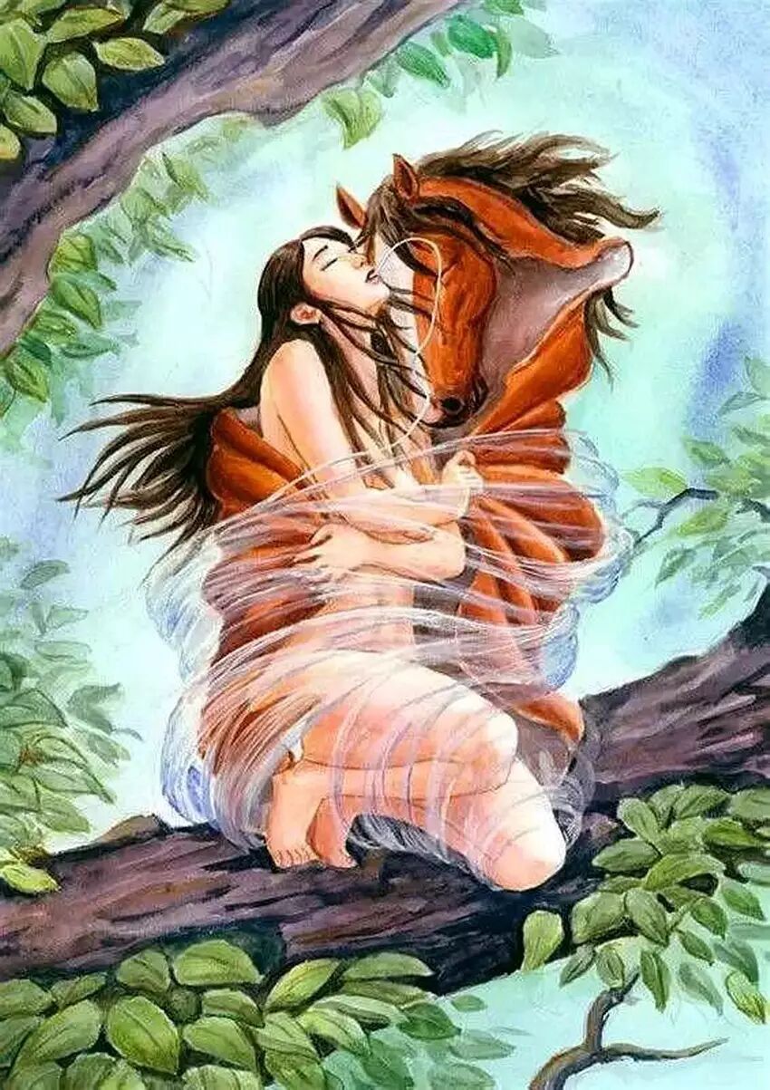 黄帝在战胜蚩尤以后非常地高兴,于是命令手下的乐官演奏乐曲,让战士们随着音乐跳起雄壮威武的舞蹈,以此来庆祝自己的胜利。就在黄帝作乐庆功时,天上下来了一位神仙。她手里拿了两捆细丝。一捆颜色像金子一样灿烂,一捆颜色像白银一样耀眼。女子自称是蚕神,特地把精美的蚕丝献给黄帝。蚕神是一个美丽的女子,惟一让人觉得奇怪的是,她身上披着一张马皮。这马皮就好象长在她身上一样,而不是穿在身上,根本不能取下来。如果蚕神把马皮左右收拢一些,那么马皮就整个地将她包围,女子就会变成一条白色的虫,长着马一样的头,人们称为蚕。